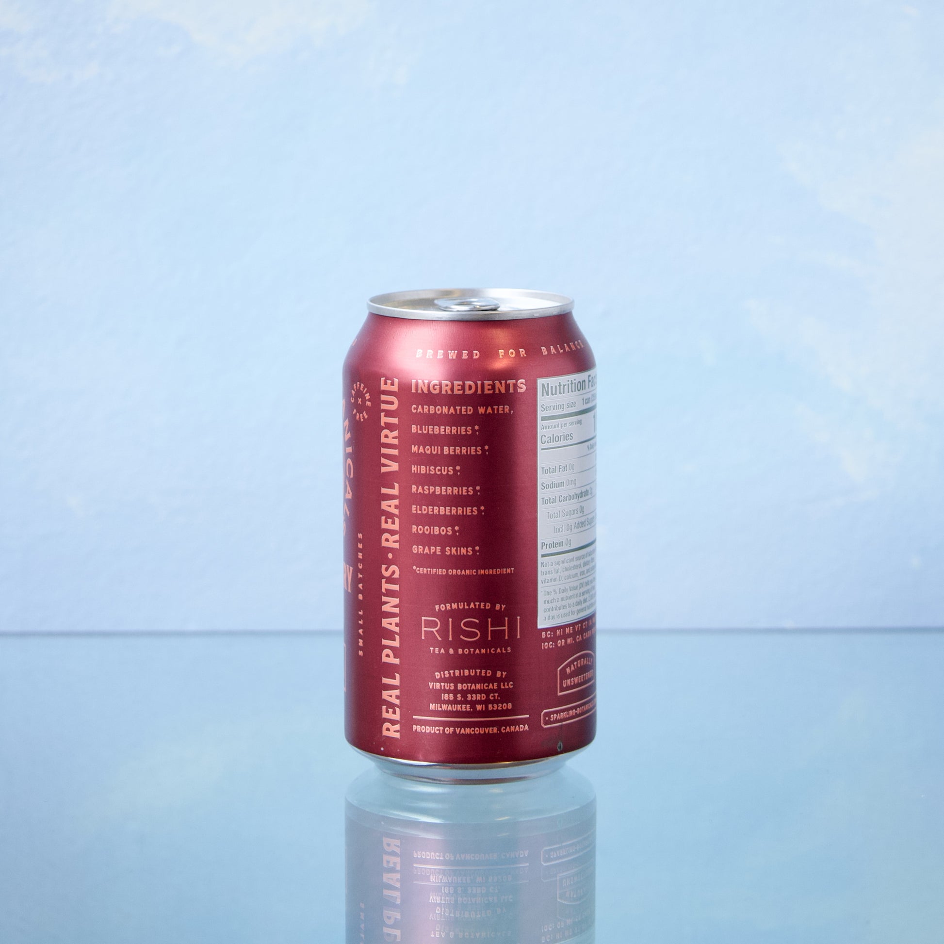 Ingredients: carbonated water, organic blueberries, organic hibiscus, organic maqui berries, organic raspberries, organic rooibos, organic elderberries, organic hawthorn leaves, organic red wine grape skins.
